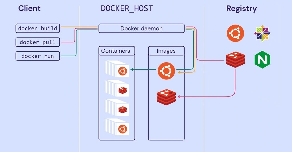 A arquitetura do Docker consiste em quatro componentes principais junto com os containers do Docker que abordamos anteriormente.
