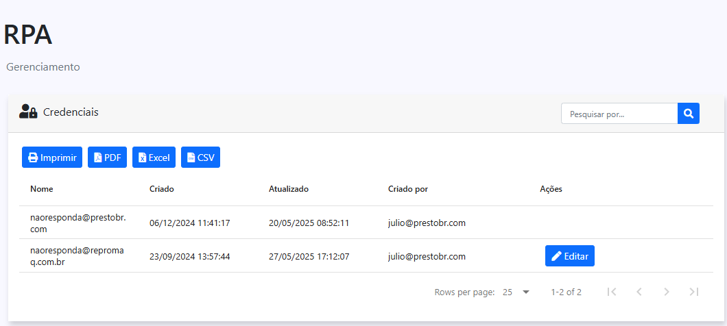 Lista de credenciais utilizadas pelas suas automações.