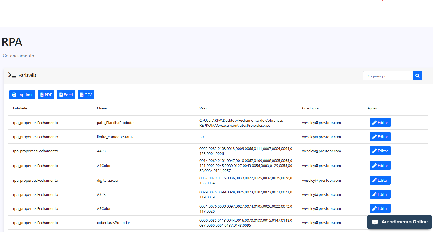 Algumas variáveis podem ser editadas diretamente através do botão Editar, permitindo ajustes rápidos sem a necessidade de intervenção técnica.