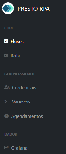 Cada área agrupa funcionalidades específicas para execução e controle das automações RPA.