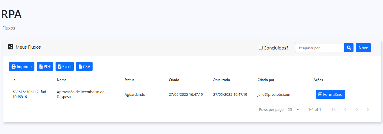Nesta página, você pode visualizar todos os fluxos que estão com alguma etapa atribuída a você, além de iniciar novos fluxos.
