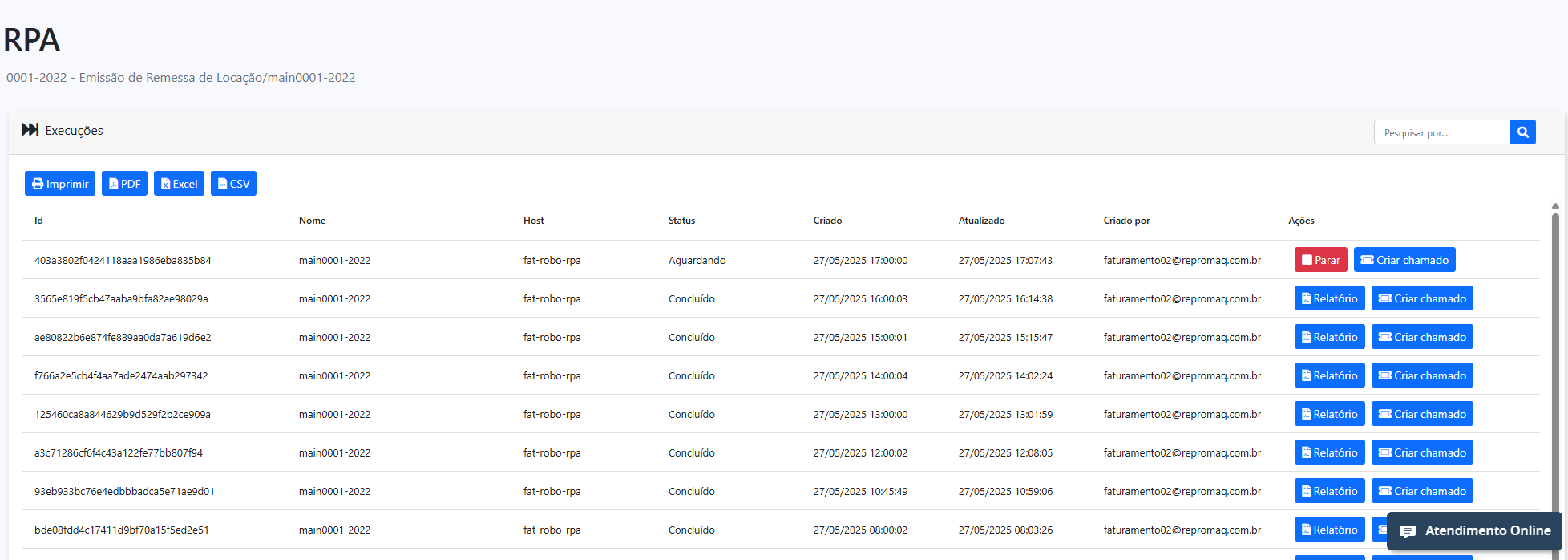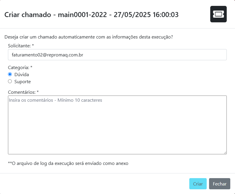 - Abrir chamados diretamente vinculados a execuções específicas, facilitando o suporte técnico